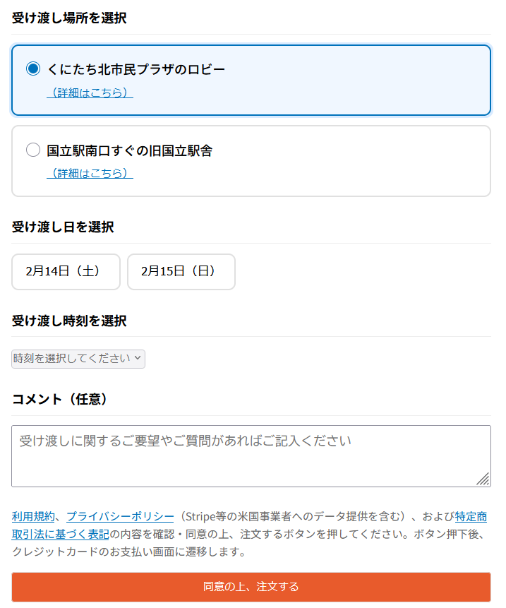 ログイン後、受け取りたい場所と日時を指定して注文を行います。場所については「詳細はこちら」から地図や施設情報を確認できるようにしました。