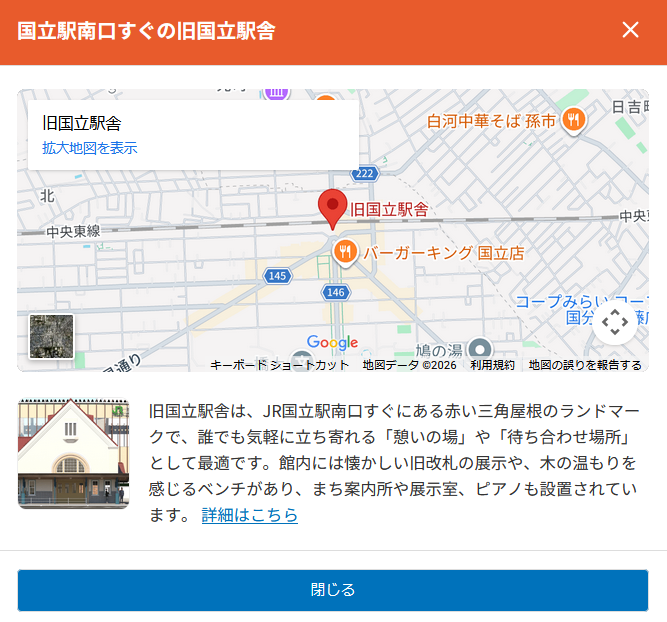 例えば、受け渡し場所の一つである「旧国立駅舎」の情報はこのように表示されます。