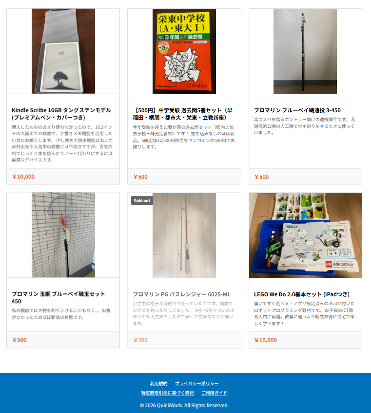 商品一覧には、不要になったおもちゃや教材を登録しています。画像付きで見やすく整理されています。