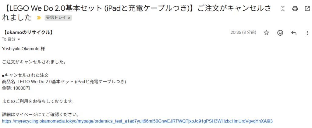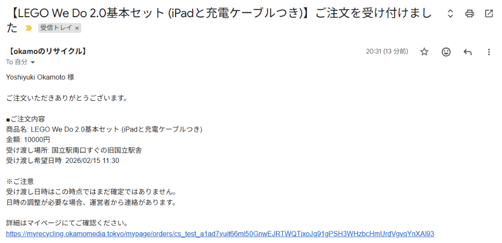 同時に、購入者には「注文を受け付けました」というメールが自動送信されます。
