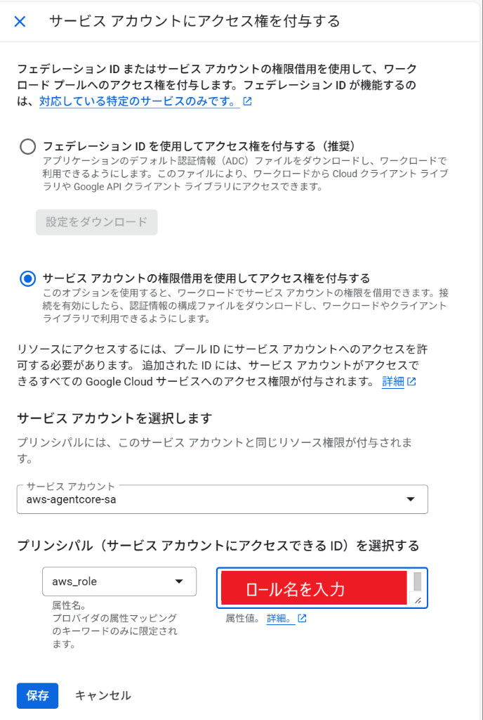 「サービスアカウントの権限借用を使用してアクセス権を付与する」を選択し、先ほどマッピングした aws_role 属性を使って制限をかけます。