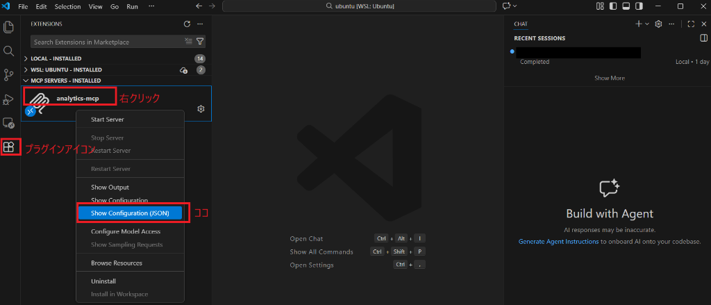 analytics-mcp(前回設定したもの)などを右クリックし、「Show Configuration (JSON)」を選択します。
