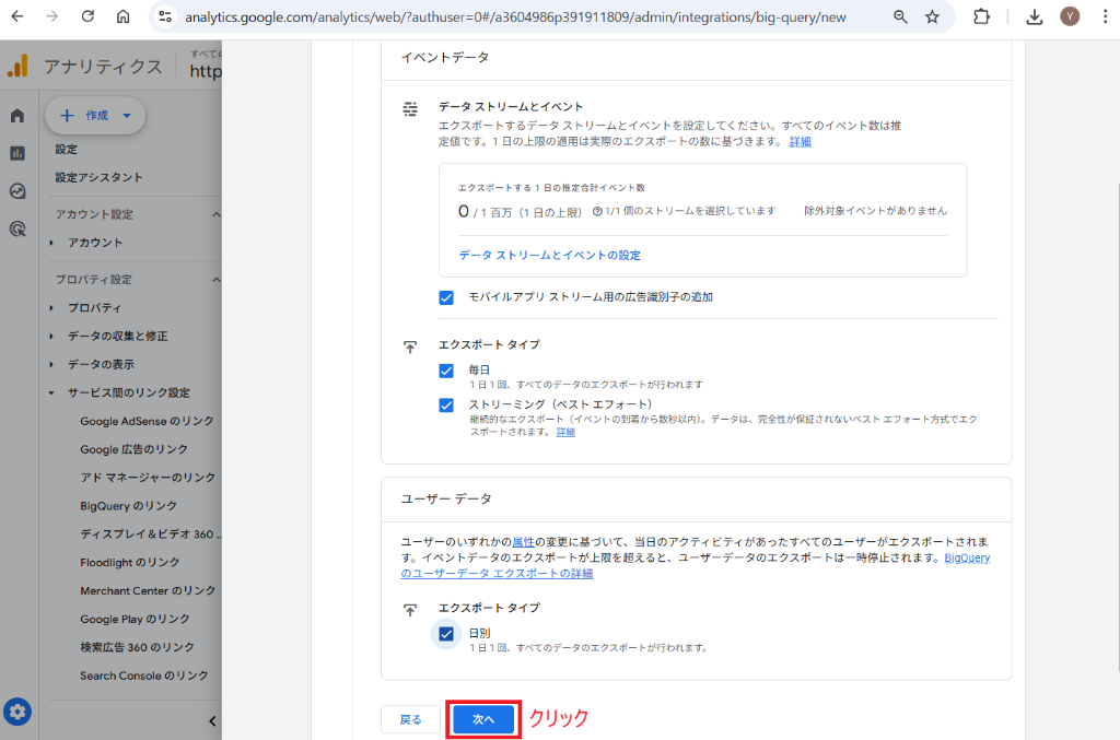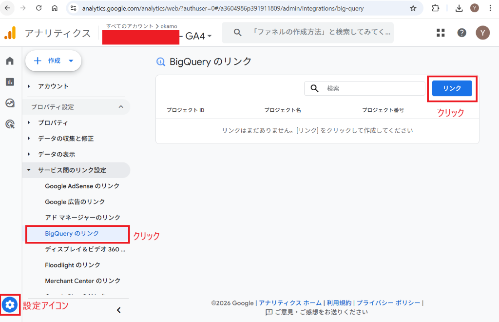 - 「サービス間のリンク設定」にある「BigQueryのリンク」をクリックします。