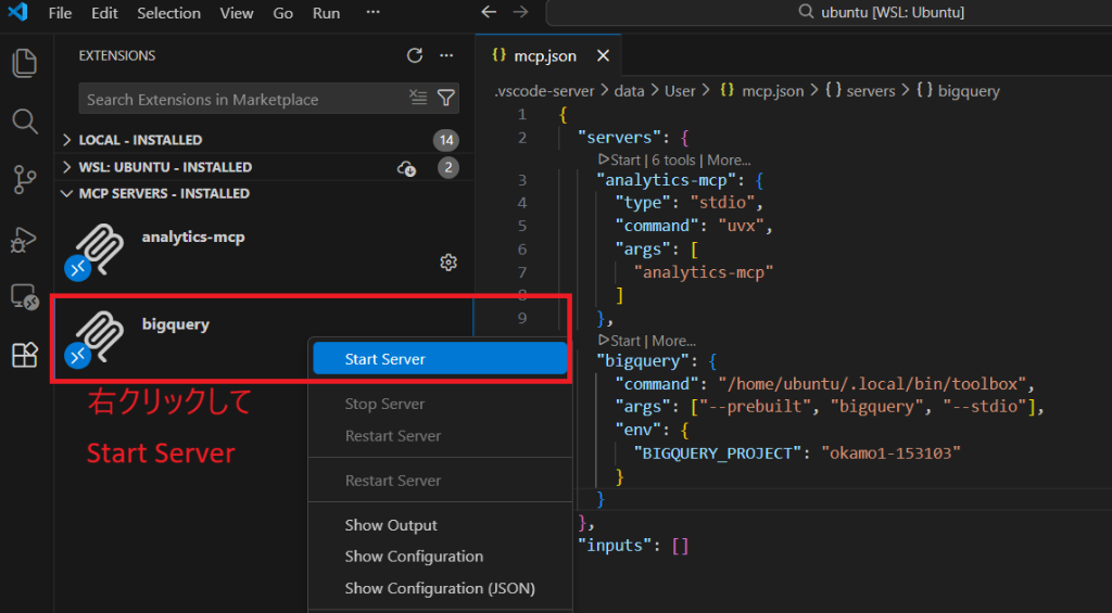新しく bigquery が表示されているはずです。右クリックして「Start Server」を選択して下さい。