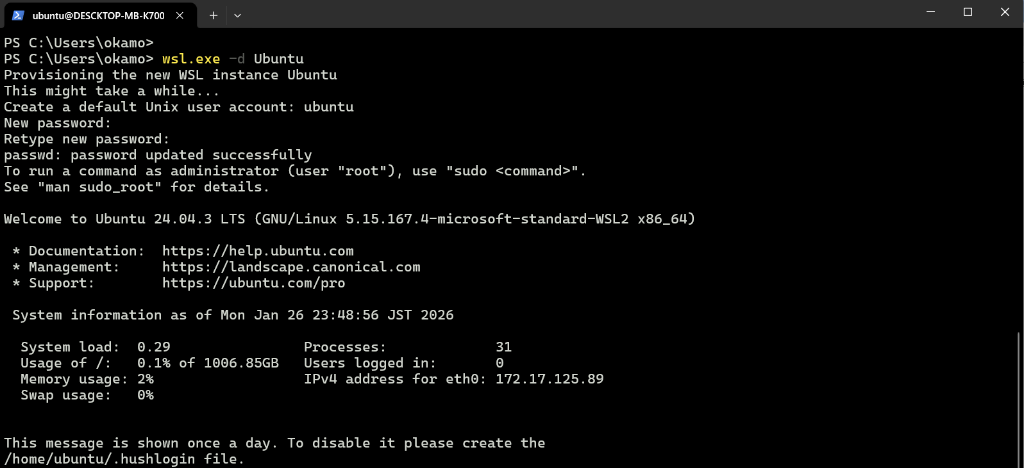 まず、Windows上でLinux環境を動かすためのWSLをセットアップします。PowerShellを管理者として実行し、以下のコマンドを実行してください。