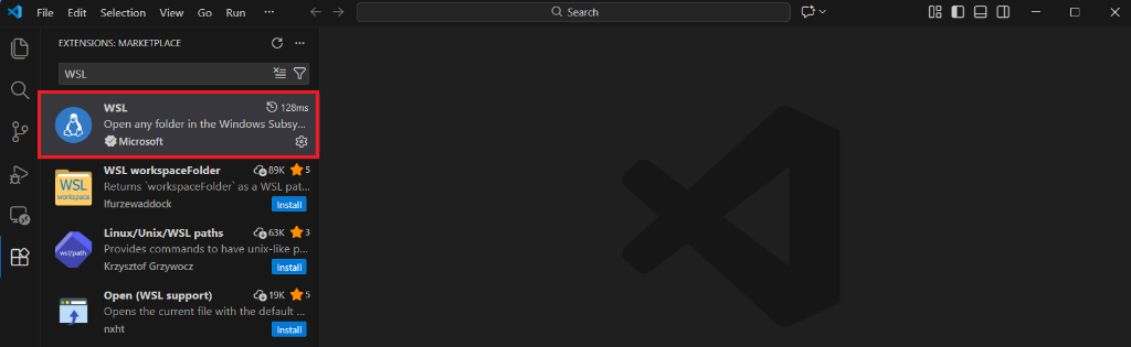 VSCodeを開き、左側の拡張機能 (Extensions) アイコンから「WSL」を検索してインストールします。