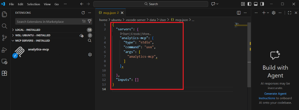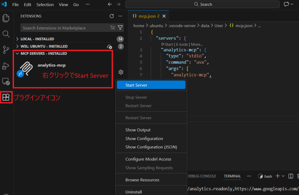 画像のように analytics-mcp を右クリックし、「Start Server」を選択してサーバーを起動します。