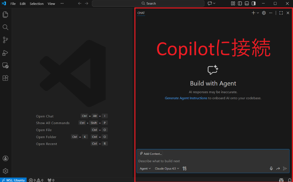 チャット画面に「Build with Agent」と表示され、準備完了の状態にします。