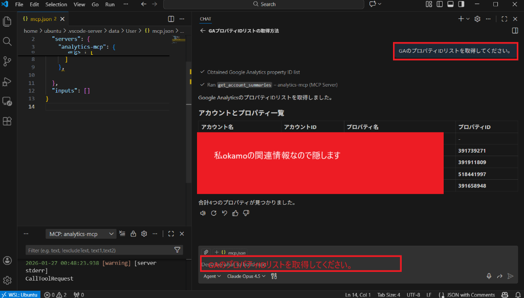画像のように、Copilotがツールを実行し、アカウントやプロパティの一覧を表形式などで返してくれれば成功です!