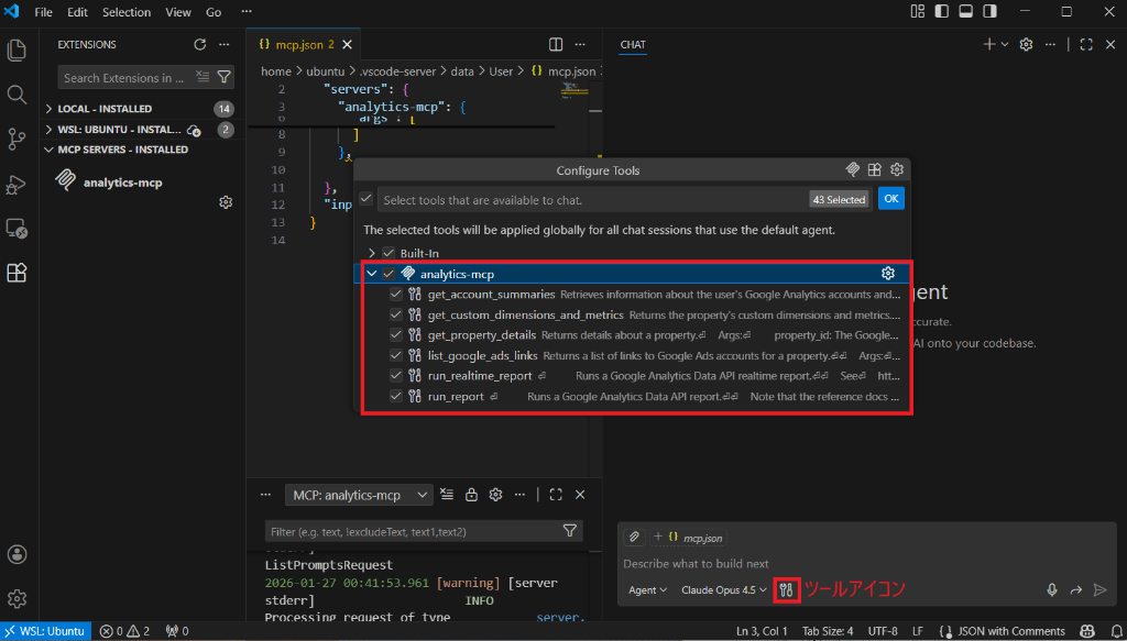 Copilotのチャット入力欄にあるツールアイコン(🔧)をクリックし、analytics-mcp が認識されているか確認します。