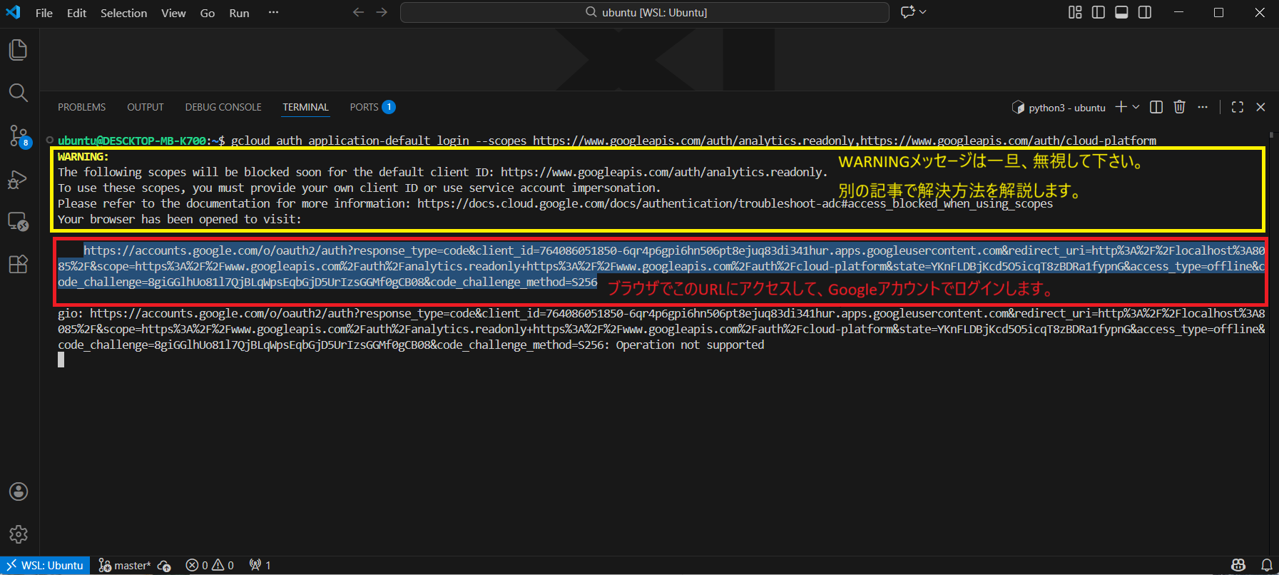 画像内の赤枠で囲まれたURLをコピーしてブラウザでアクセスし、GA4権限を持つGoogleアカウントでログインして認証を完了させてください。